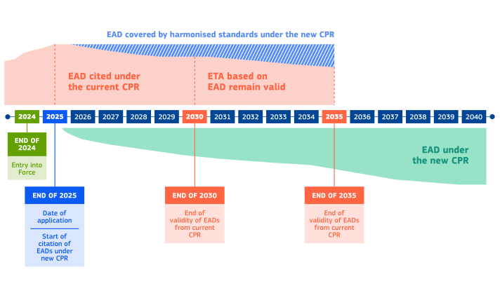 EADs cited under the outgoing CPR can be used for issuing ETAs until 2030 (5 years after the date of application of the new CPR). The related ETAs can be used for CE marking products until 2035 (ten years after the date of application of the new CPR), provided that the product and intended use are not covered by a mandatory performance HTS. Once a new performance HTS is applied, it becomes the only way to market a product, and the EAD and related ETAs can no longer be used for CE marking.